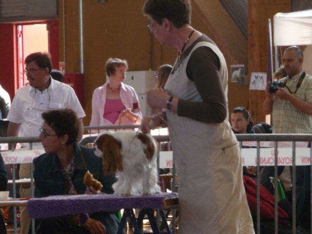 Exc sujet. Exc proportion. Exc tête, crâne et yeux. Attache d'oreille bien frangée. Exc encolure,poitrine, ligne de dos, épaule et av.main. Exc post. robe marquée et soutenue. Exc démarche.